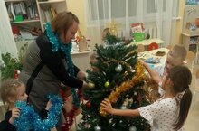 На фото 12 группа с воспитателем Аленой Сергеевной украшают новогоднюю елку.