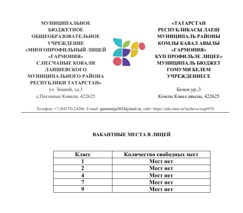 Муниципальное бюджетное общеобразовательное учреждение "Многопрофильный лицей "Гармония" с. Песчаные Ковали Лаишевского муниципального района Республики Татарстан