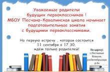 МБОУ Песчано-Ковалинская школа начинает подготовительные занятия с будущими первоклассниками. На первую встречу, которая состоится 11 сентября в 17:30, ждем только родителей!