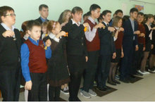 Сегодня в школе прошла акция. В 11.00 ученики и учителя собрались на общешкольную линейку и почтили память погибших в концлагерях колокольным звоном.