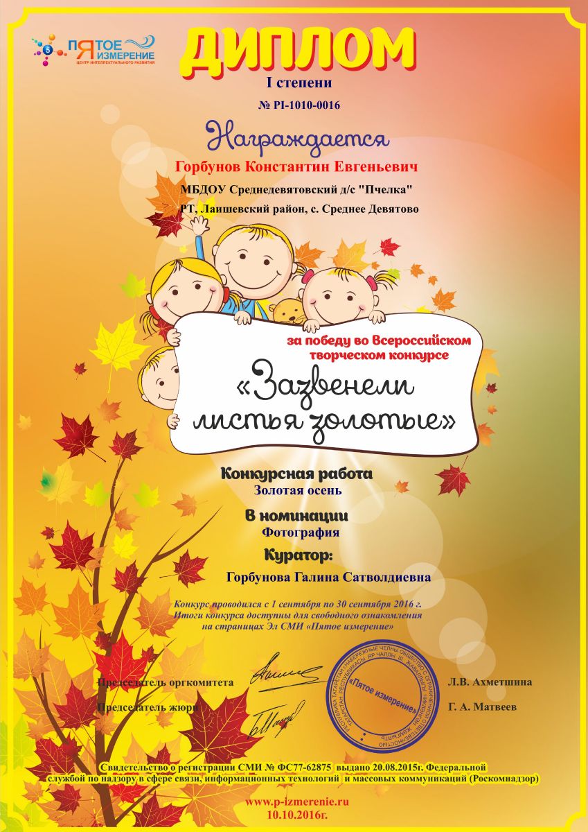 Опубликовано: 25.10.2016Поздравляем Горбунова Константина с победой во Всероссийском творческом конкурсе "Зазвенели листья золотые"