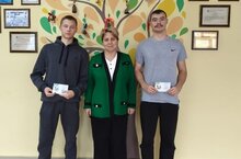 16 ноября в школу были приглашены выпускники 2024 года Кузовов Евгений и Солдатенков Матвей. Директор школы Жесткова А. П. вручила ребятам значки "Готов к труду и обороне".