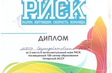 Команда "Наследники" заняла 3 место в интеллектуальной игре РИСК, посвящённой 100-летию образования ТАССР. Руководитель: Блохина Е.Ю. учитель истории и обществознания.