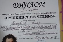Учащийся 6 класса Галавиев Нияз стал Дипломантом второй степени во Всероссийском творческом конкурсе "Пушкинские чтения", которые проходили в г. Набережные Челны. Руководитель Кадырова М. К.