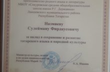 Учитель родного языка и литературы Назмиев С. Ф награжден "Благодарственным письмом" за вклад в сохранение и развитие татарского языка и народной культуры Министерством культуры правительства Республики Марий Эл.Поздравляем! Желаем дальнейших успехов!