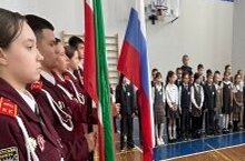 Утро понедельника в школе традиционно началось с торжественной линейки, церемонии поднятия флага и исполнения гимна Российской Федерации, в которой приняли участие ученики 1-х классов.