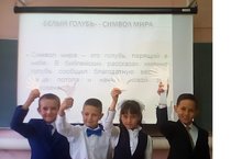 На уроке ребята вспомнили значение слова мир, познакомились с символом мира – голубем, а также повторили государственные символы (флаг, герб, гимн) и посмотрели фильм «Всероссийский урок мира».