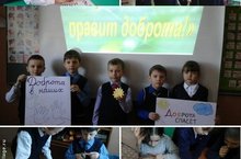 День начался с песни «Дорогою добра» Что такое доброта? Доброта – это отзывчивость, душевное расположение к людям, стремление делать добро другим. Все учащиеся с 1 по 4 класс были заняты делом. Сначала мы сделали Солнышки Добра, потом подарили эти солнышки директору школы, учителям и поварам говорили им добрые слова. В процессе беседы создали два плаката «Доброта спасёт мир» и «Доброта в наших руках». Вспомнили с учащимися какие они добрые дела совершали и послушали песню «Если добрый ты…».