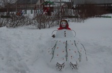 Бабу Снежную слепили, разукрасить не забыли: брови черные дугой и платочек расписной!