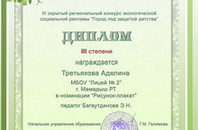 Третьякова Аделина, ученица 3 Б класс МБОУ "Лицей №2 города Мамадыш" заняла 3 место в III открытом региональном конкурсе экологической социальной рекламы "Город под защитой детства" в номинации "Рисунок-плакат". Руководитель - Э.Н.Багаутдинова.