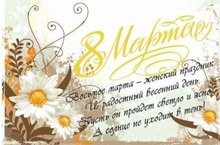 В Международный женский день мы желаем вам счастья и благополучия! Пусть весна принесет много грандиозных идей, надежд на их свершение и веры в результат! А главное сил, терпения и удачи для их осуществления! С праздником!