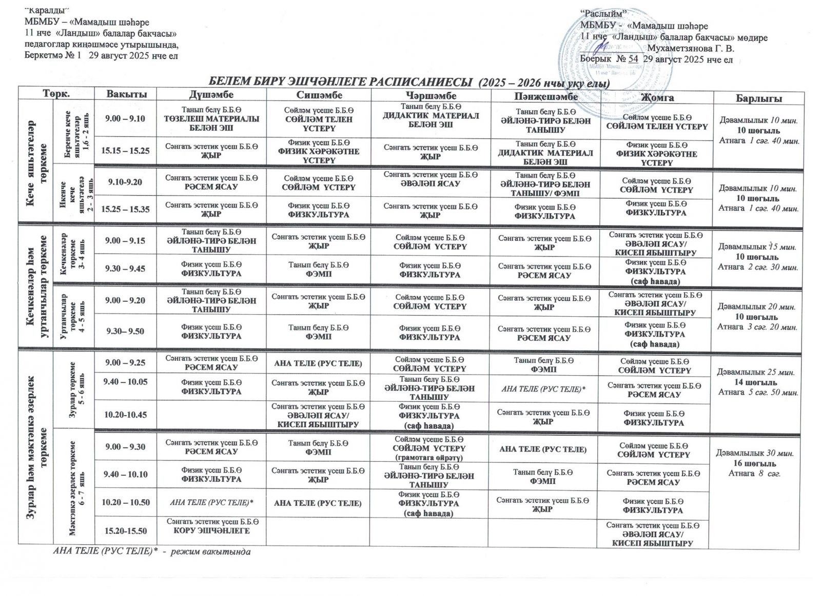 Режим работы детского сада: 5 - ти дневная рабочая неделя; длительность работы детского сада – 12 часов: с 6.30 до 18.30 часов ежедневно, кроме праздничных и выходных - субботы, воскресенья. Основной структурной единицей детского сада является группа детей дошкольного возраста. В группах общеразвивающей направленности предельная наполняемость устанавливается в зависимости от возраста детей и с потребностью мест.