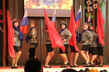Педагоги и сотрудники "Нухрата" выступают на сцене районного Дома культуры.