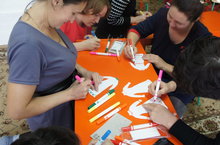 Татар орнаментлары белән әниләр курчакка күлмәк бизәделәр.