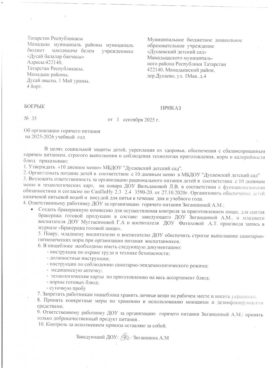 По любым вопросам организации питания детей вы можете обратиться к заведующему МБДОУ "Дусаевский детский сад"- Зиганшиной Алсу Мансуровне по телефону 89178829443