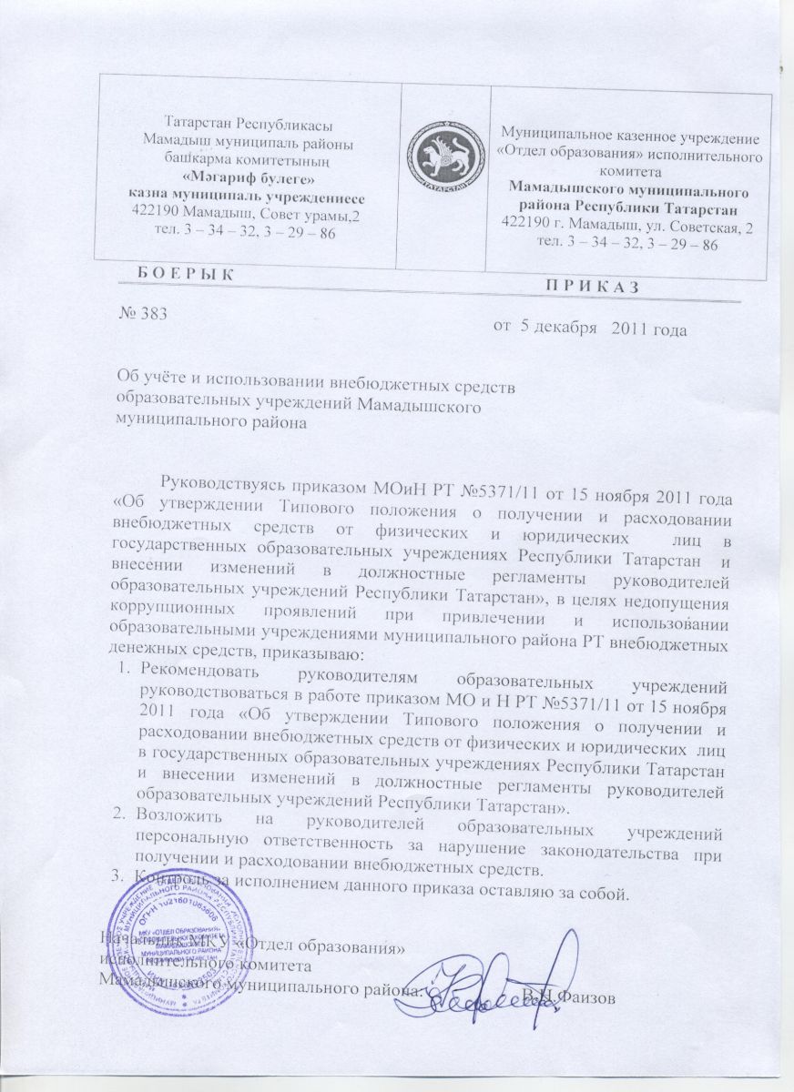 Об учете и использовании внебюджетных средств образовательных учреждений Мамадышского муниципального района