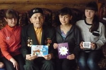 Акция «Дорогой наш ветеран». Девочки из 10 класса сделали открытки, цветочки своими руками и подарили ветерану ВОВ Динмухаметову Г.
