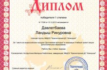 Дипломом победителя 1 степени награждается Давлетбаева Ландыш Ринуровна во всероссийском конкурсе "Достижения молодых" в номинации Учебный проект секции Дополнительное образование. Работа:Мы с тобой природа. Руководитель:Нотфуллина Миляуша Рафгатовна.