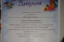 Наш воспитанник Бахметов Тимур сегодня принял участие в конкурсе чтецов и получил диплом победителя среди участников дошкольных и общеобразовательных учреждений Российской Федерации. Поздравляем его! Педагог: Мугтасимова Фанзия Марселевна.