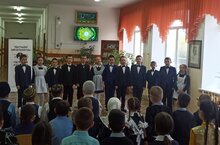 Нарядно одетые дети, начиная с младших классов, с георгиевскими лентами на груди торжественно, уверенно маршировали, исполняя военные песни. Классы продемонстрировали свои умения ходить строевым шагом, четко выполнять команды, дружно, все вместе петь строевую песню.