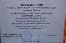 В районном конкурсе детского творчества "Посвящаю Победе" ученица 2 класса Гимадиева Диля заняла 1 место. Руководитель Фатыхова Л.Р.