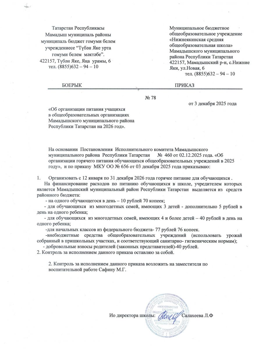 Приказ "Об организации питания обучающихся ОУ в 2024 году в МБОУ "Нижнеякинская СОШ" Мамадышского муниципального раона РТ23-2024 учебный год