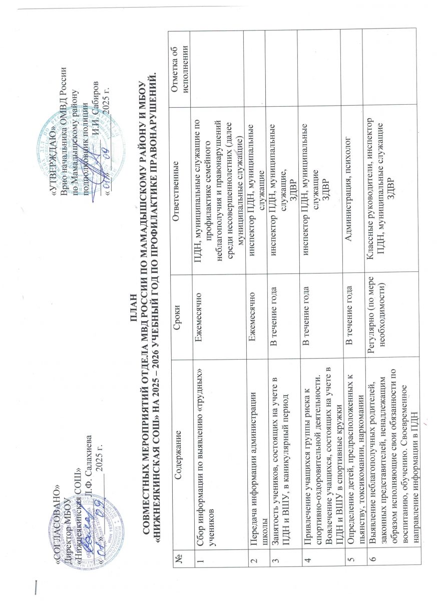План совместных мероприятий отдела МВД России по Мамадышскому району и МБОУ "Нижнеякинская СОШ" 2025-2026 учебный год 2