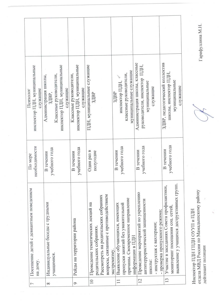 План совместных мероприятий отдела МВД России по Мамадышскому району и МБОУ "Нижнеякинская СОШ" 2