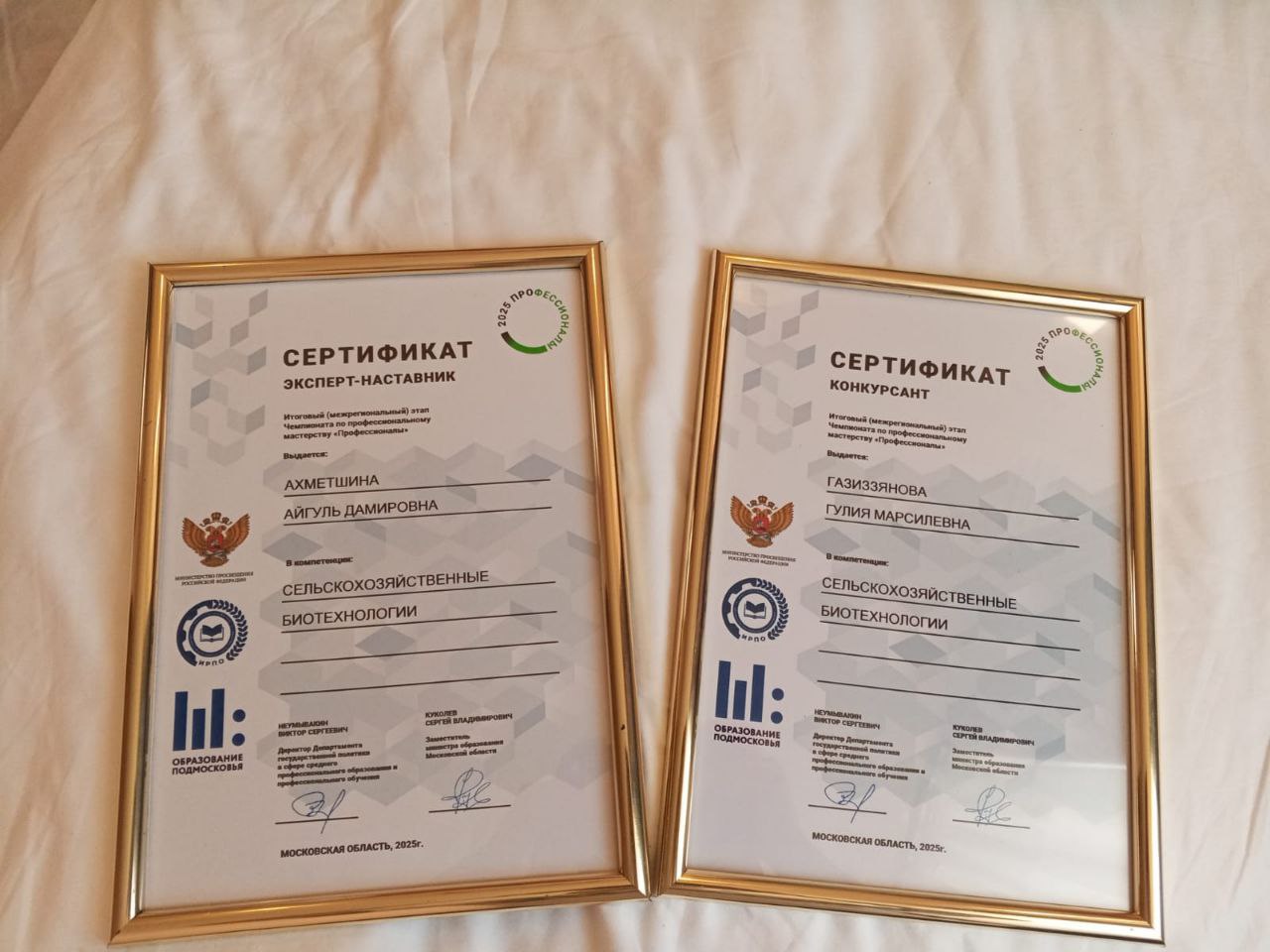 С 14 по 18 апреля 2025 г. в городе Коломна Московской области прошёл Итоговый (межрегиональный) этап Всероссийского чемпионатного движения по профессиональному мастерству «Профессионалы» по компетенции «Сельскохозяйственные биотехнологии». Республику Татарстан представляла студентка 1 курса Газиззянова Гулия.