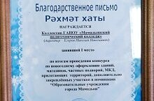 Глава муниципального района А.П. Иванов наградил благодарственным письмом коллектив ГАПОУ «Мамадышский политехнический колледж», занявший I место по итогам проведения конкурса по новогоднему оформлению зданий, магазинов, частных подворий, МКД, прилегающих территорий, дополнительно закрепленных участков в номинации «Образовательные учреждения города Мамадыш».