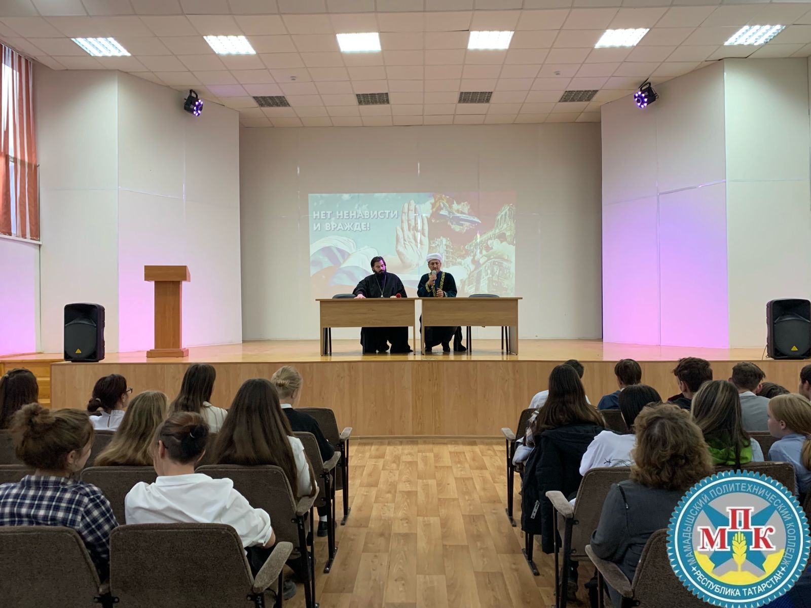 13.10.22 18 .10.22 толерантлык, халыкара дошманлыкка һәм экстремизмга юл куймау темаларына профилактик әңгәмәләр үткәрү кысаларында студентларның дини конфессияләр вәкилләре-изге Ксения гыйбадәтханәсе рухание — Олег һәм Мамадыш районы мөхтәсибе — Илһам хәзрәт белән очрашуы булды.