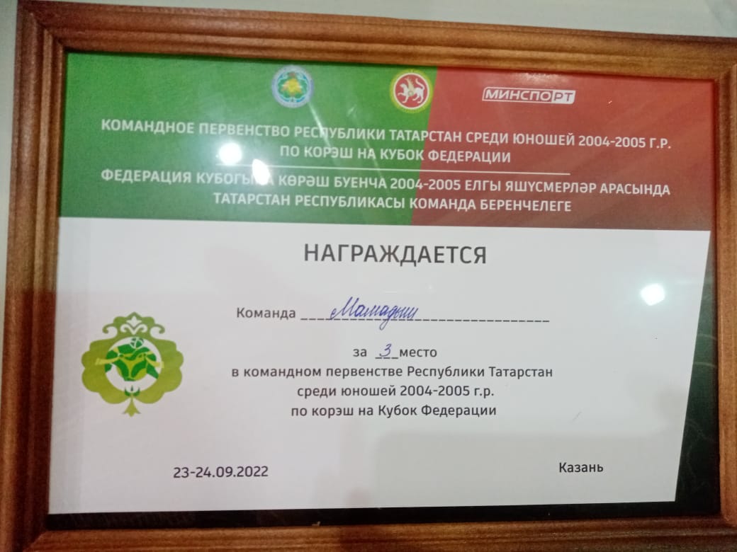 24 сентября состоялось командное первенство РТ среди юношей 2004-2005 гг. по корэш на Кубок Федерации. Поздравляем наших студентов, занявших почетное 3 место! 24 сентябрьдә Федерация Кубогына көрәш буенча 2004-2005 елларда яшүсмерләр арасында ТР команда беренчелеге узды. 3 нче урын алган студентларыбызны котлыйбыз!