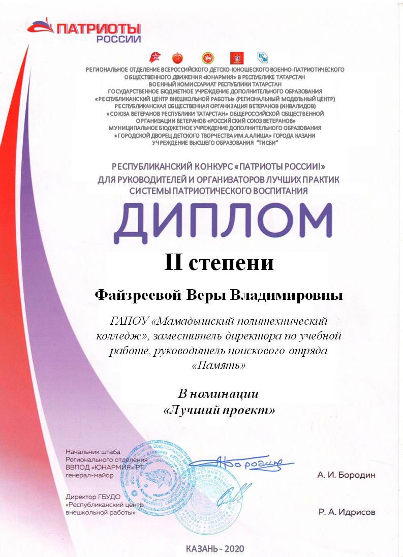 Подведены итоги республиканского конкурса "Патриоты Росси и для руководителей и организаторов лучших практик системы патриотического воспитания. Диплома II степени удостоена Файзреева В.В., заместитель директора по учебной работе , руководитель поискового отряда "Память" в номинациях "Лучший проект" и "Защита пректа". Поздравляем!