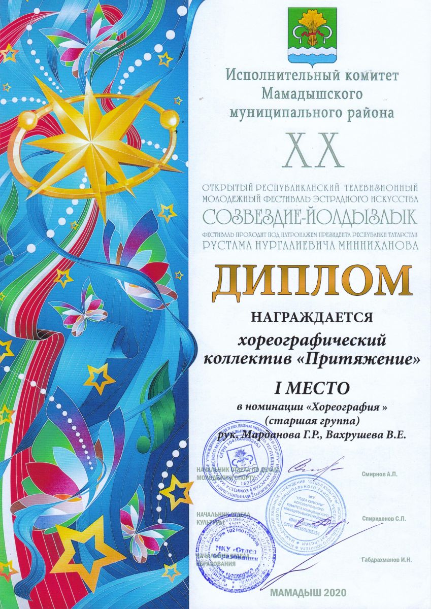 28 февраля 2020 г. состоялся открытый Республиканский телевизионный молодежный фестиваль эстрадного искусства «Созвездие-Йолдызлык». Хореографический коллектив «Притяжение» ГАПОУ «Мамадышский политехнический колледж» в номинации «Хореография» (старшая группа) под руководством Мардановой Г.Р. и Вахрушевой В.Е. занял почетное I место. Поздравляем наших конкурсантов!