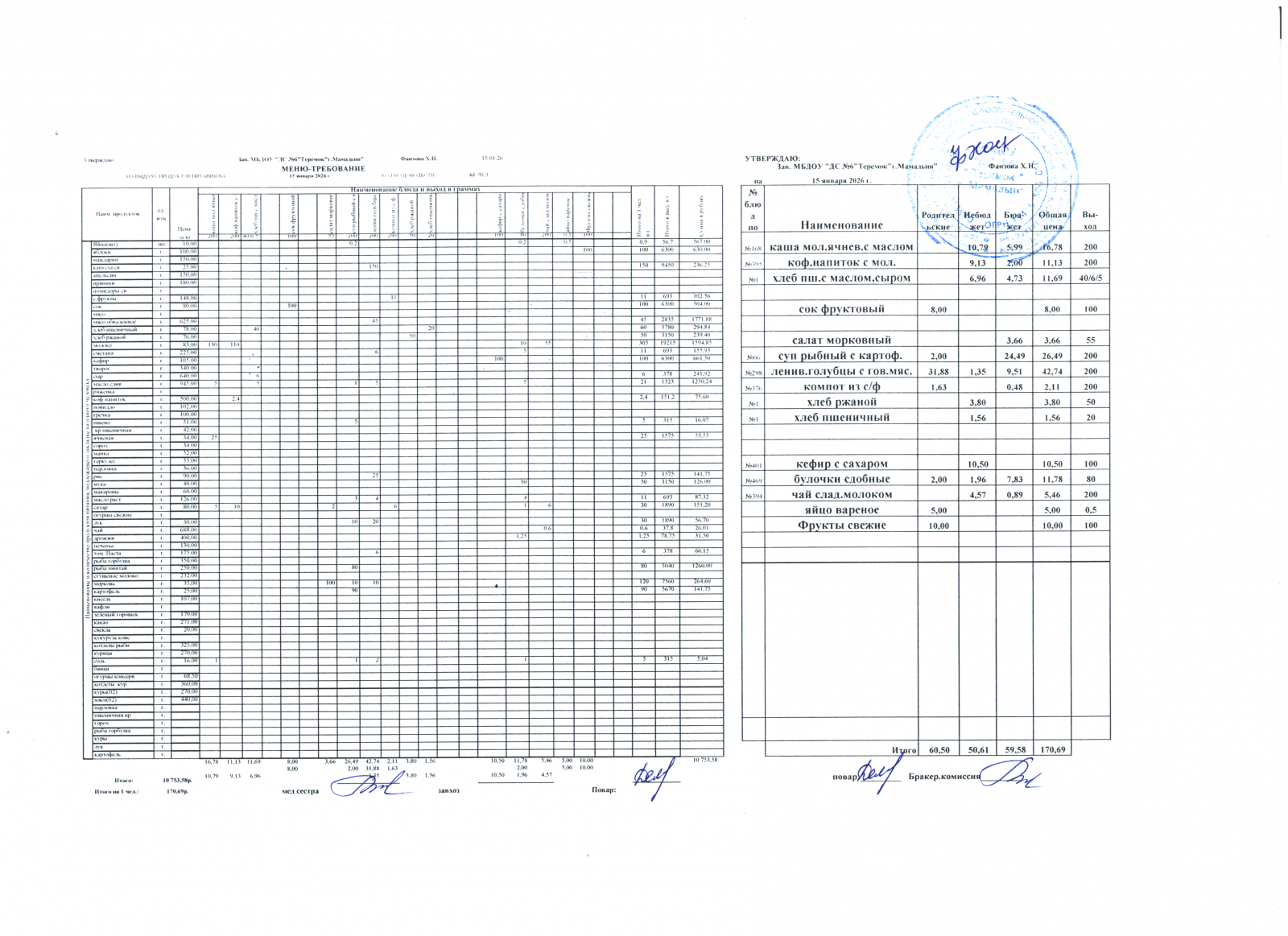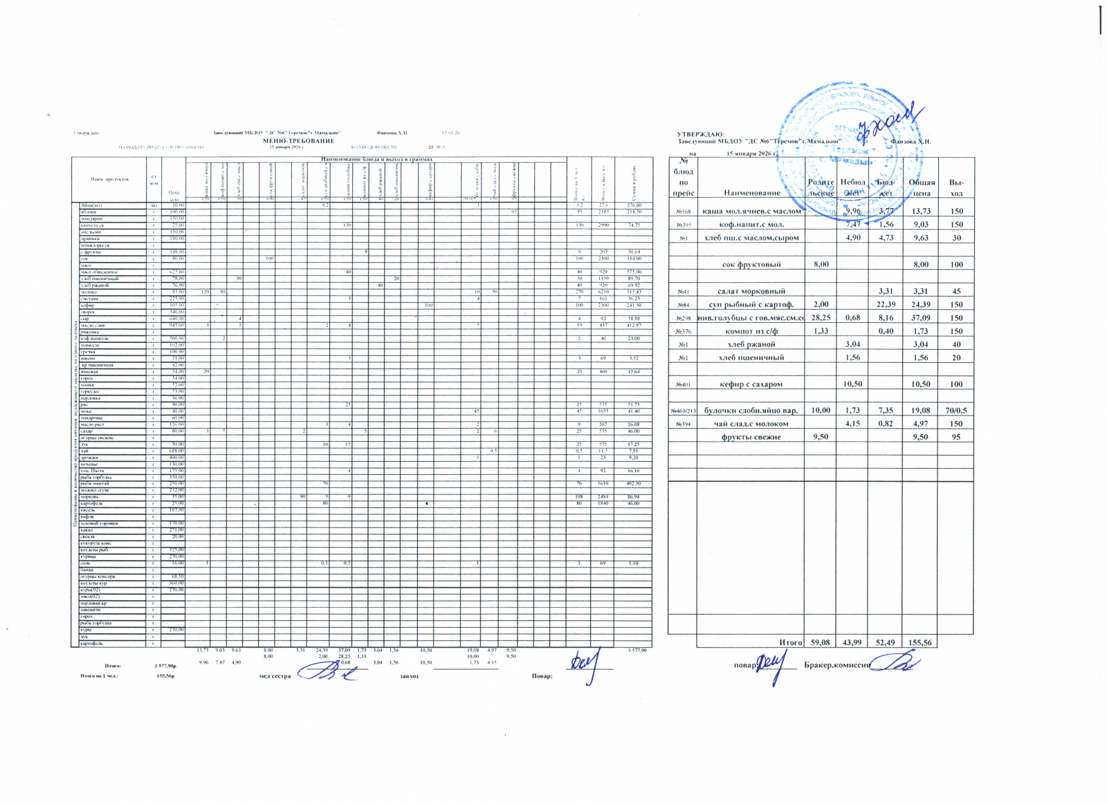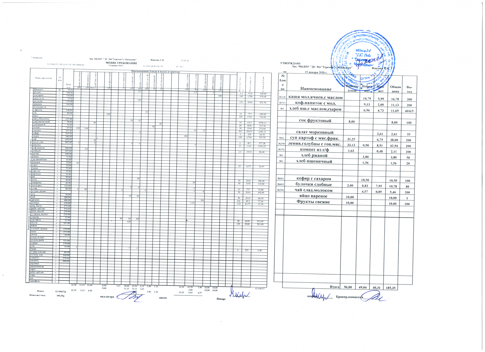 Меню дошкольники 15.01.2026