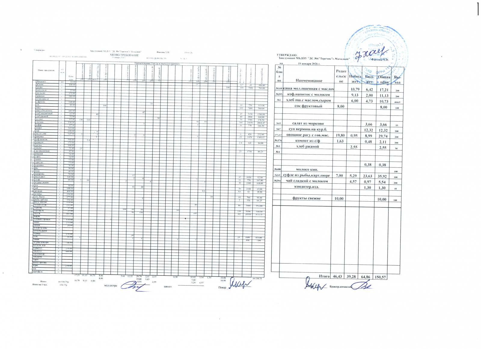 Меню дошкольники 19.01.2026