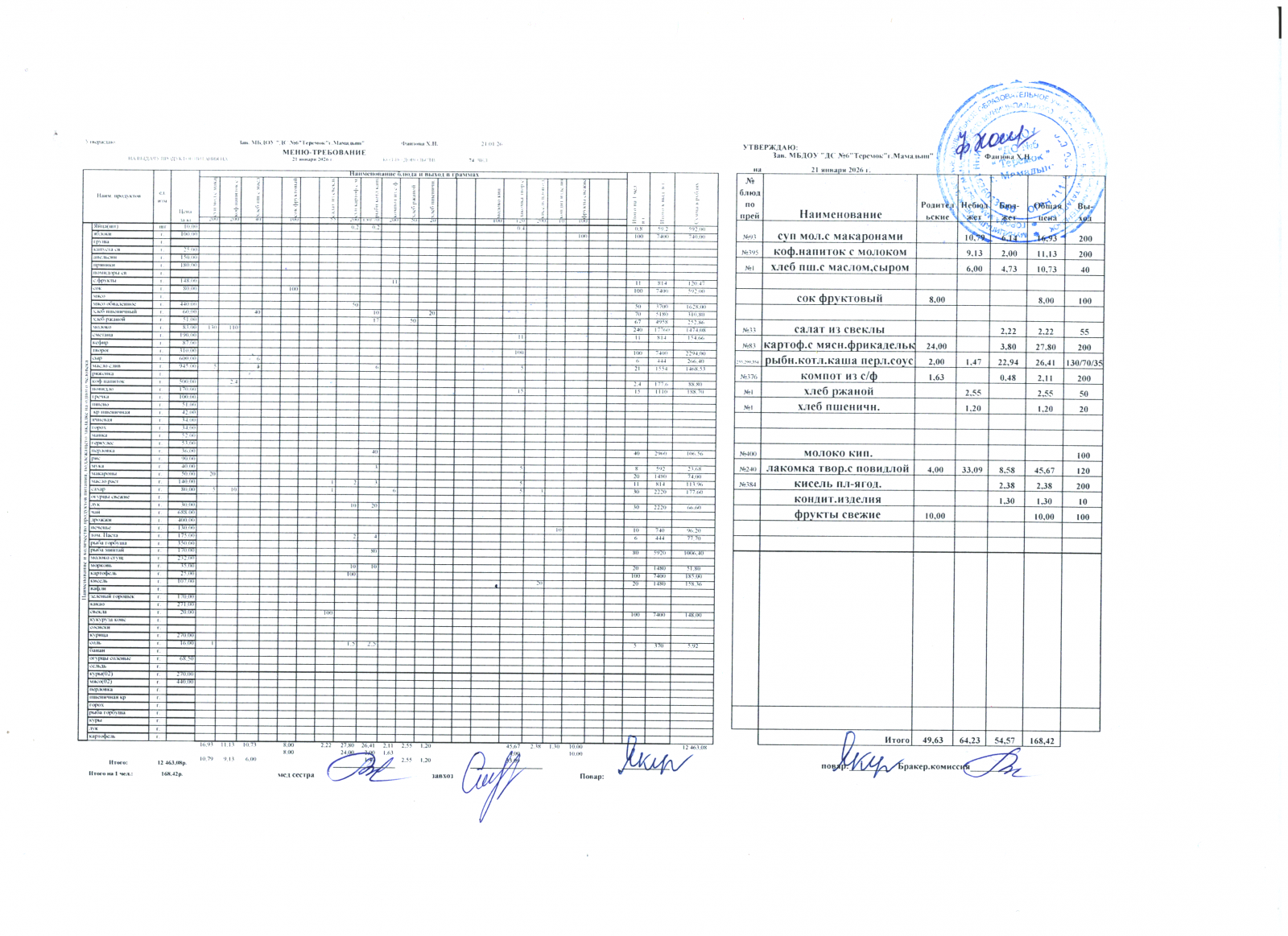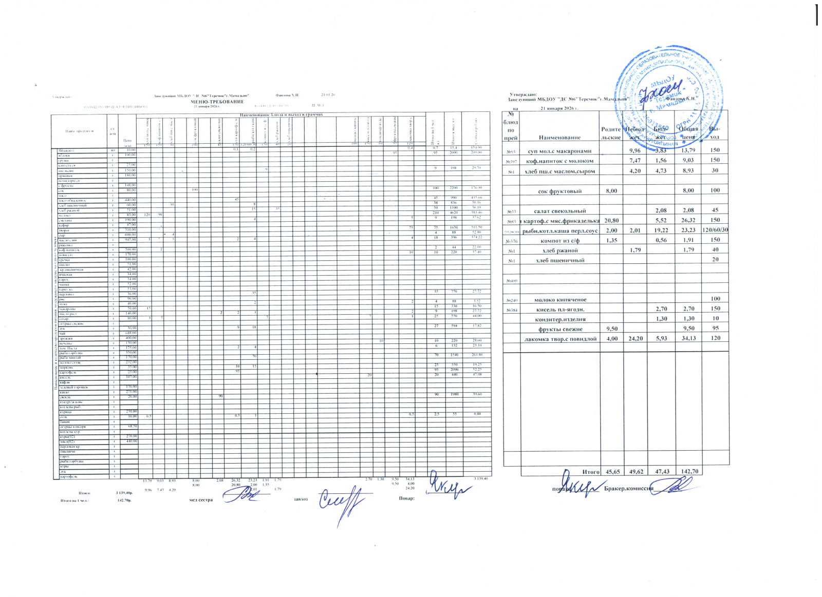 Меню дошкольники 21.01.2026