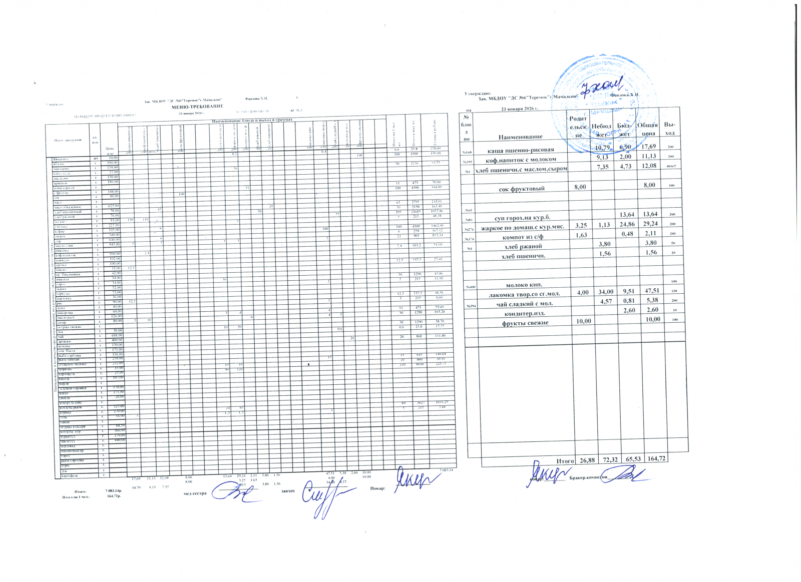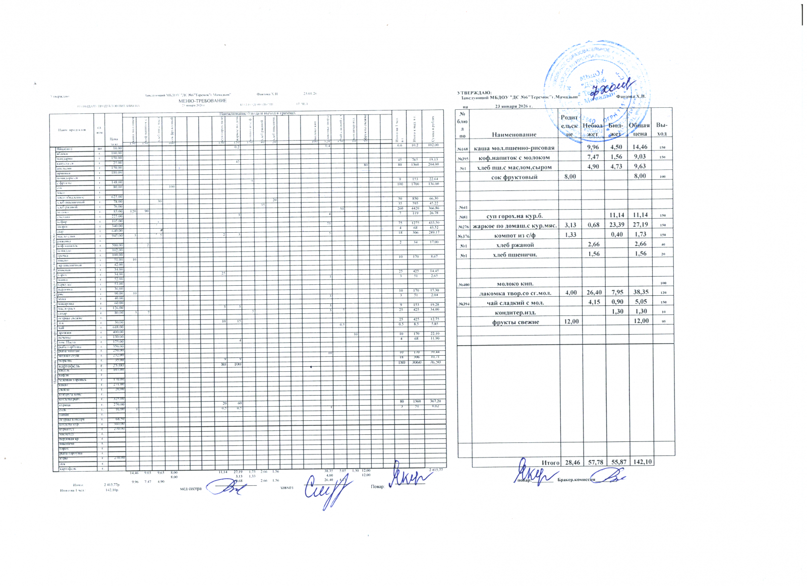 Меню дошкольники 23.01.2026