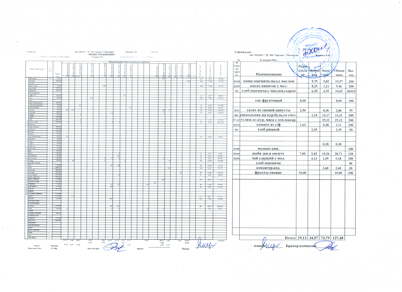 меню дошкольники 26.01.2026