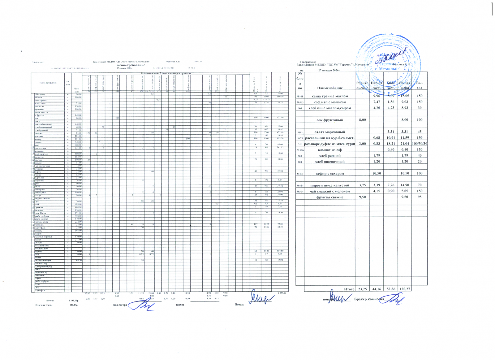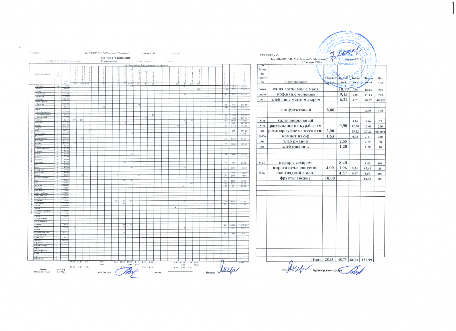меню дошкольники 27.01.2026