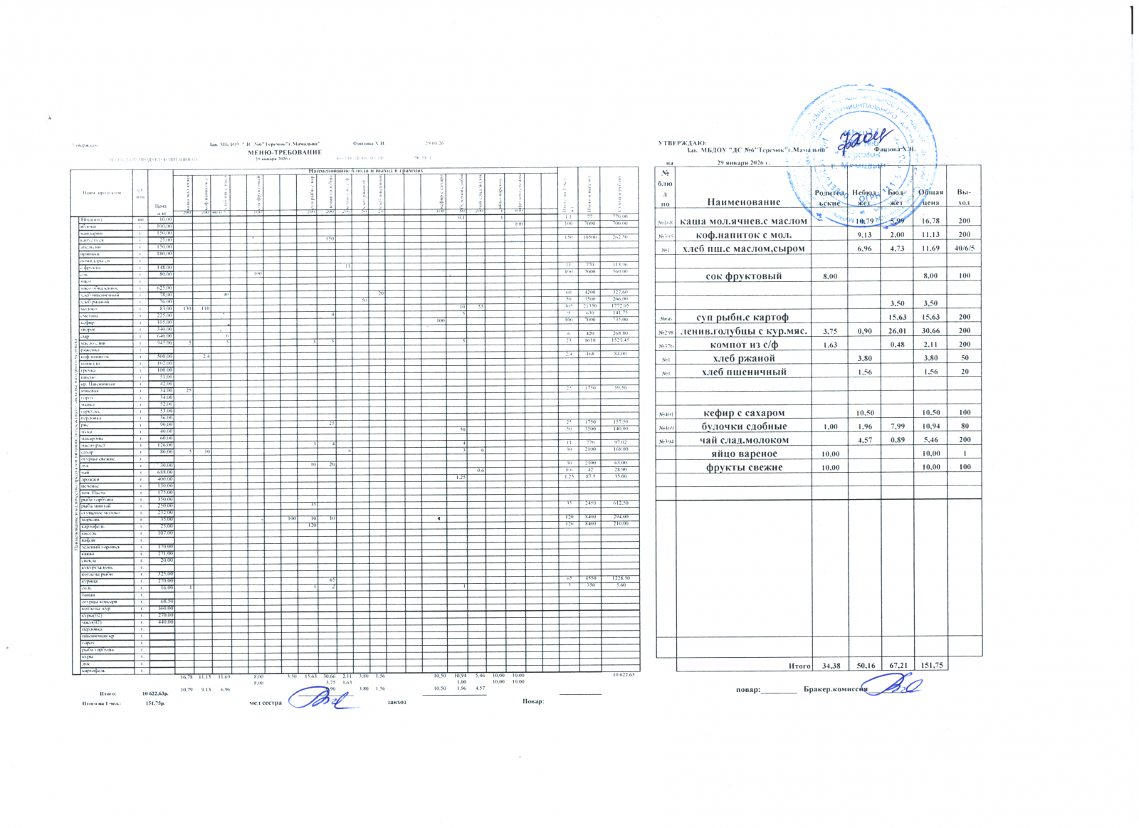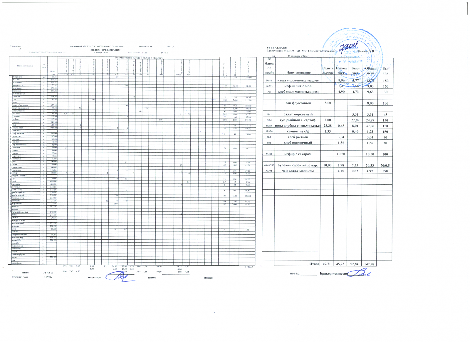 меню дошкольники 29.01.2026