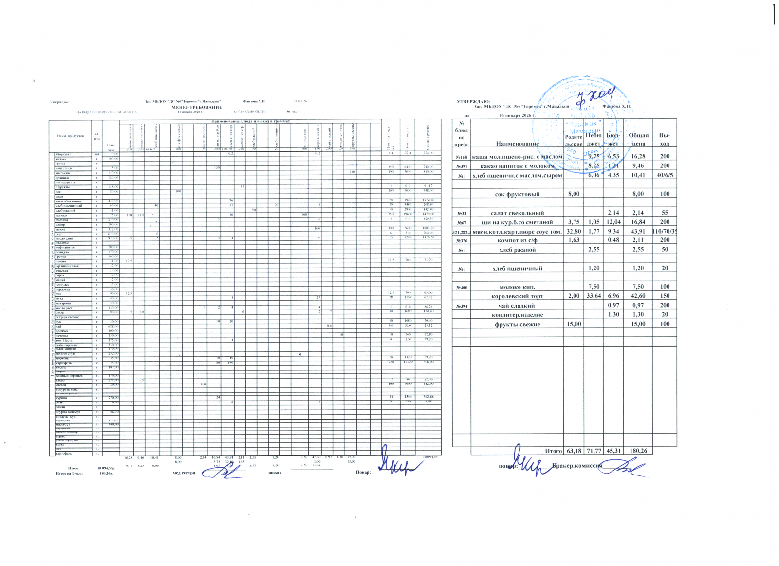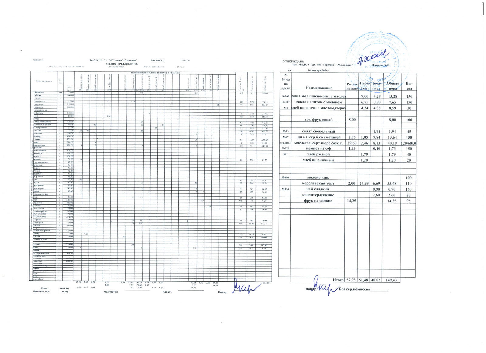 Меню дошкольники 16.01.2026