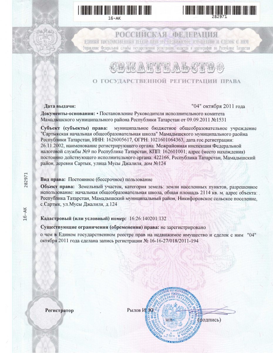Адрес: 422166, Республика Татарстан, Мамадышский район, д. Сартык, ул. М.Джалиля, д. 124