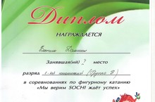 19-20 февраля 2014 года наш ученик 4а класса Костин Даниил принял участие в соревнованиях по фигурному катанию "Мы верим SOCHI ждет успех", который проходил в ЛД "Олимп" г. Мамадыш. Среди фигуристов 1-го юношеского разряда (группа Б) Даниил занял 1 место.