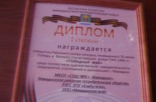 Дипломом 1 степени награждается победитель - наша школа (Мамадышское районное потребительское общество, РЭГС ЭПУ "Елабугагаз", ООО "Мамадышгазстрой") районного смотра-конкурса, посвященного 70-летию Победы в ВОВ 1941-1945 гг., "Победный май" среди коллективов художественной самодеятельности предприятий, учреждений и организаций г. Мамадыш. Желаем дальнейших творческих побед!