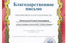 Руководитель проекта "Молодежное движение" Ожогин Д.С. выражает благодарность Запольской Елене Николаевне, учителю биологии и географии, за активное участие в конкурсе.