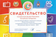 Поздравляем Хамидуллину Диляру, ученицу 10б класса МБОУ "СОШ № 4 г. Мамадыш", участника Всероссийского творческого конкурса "Радуга безопасности" в номинации конкурса социальной рекламы "Безопасным дорогам скажем - ДА" и желаем ей творческих побед!