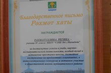 Мы поздравляем Рахматуллину Регину, ученицу 10а класса, Исхакова Ришата, ученика 10а класса, Мичурину Юлию, ученицу 7а класса за достигнутые успехи в учебе, научно-исследовательской деятельности, особый вклад в повышение престижа школы, достойное выступление на предметных олимпиадах, в интеллектуальных конкурсах и активное участие в общественной жизни муниципального района. Они были награждены Благодарственными письмами Главы района Иванова А.П. Мы их поздравляем и желаем дальнейших побед!