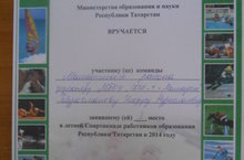 Диплом Министерства образования и науки РТ вручается участнику команды, директору МБОУ "СОШ № 4 г. Мамадыш" Габдрахманову Ильдусу Нурисламовичу, занявшему 1 место в летней Спартакиаде работников образования РТ в 2014 году.