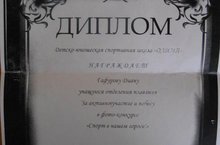Дипломом ДЮСШ "Олимп" награждается Гафурова Диана, 7а класс, заактивное участие и победу в фото-конкурсе "Спорт в нашем городе!" Молодец, желаем тебе дальнейших побед!